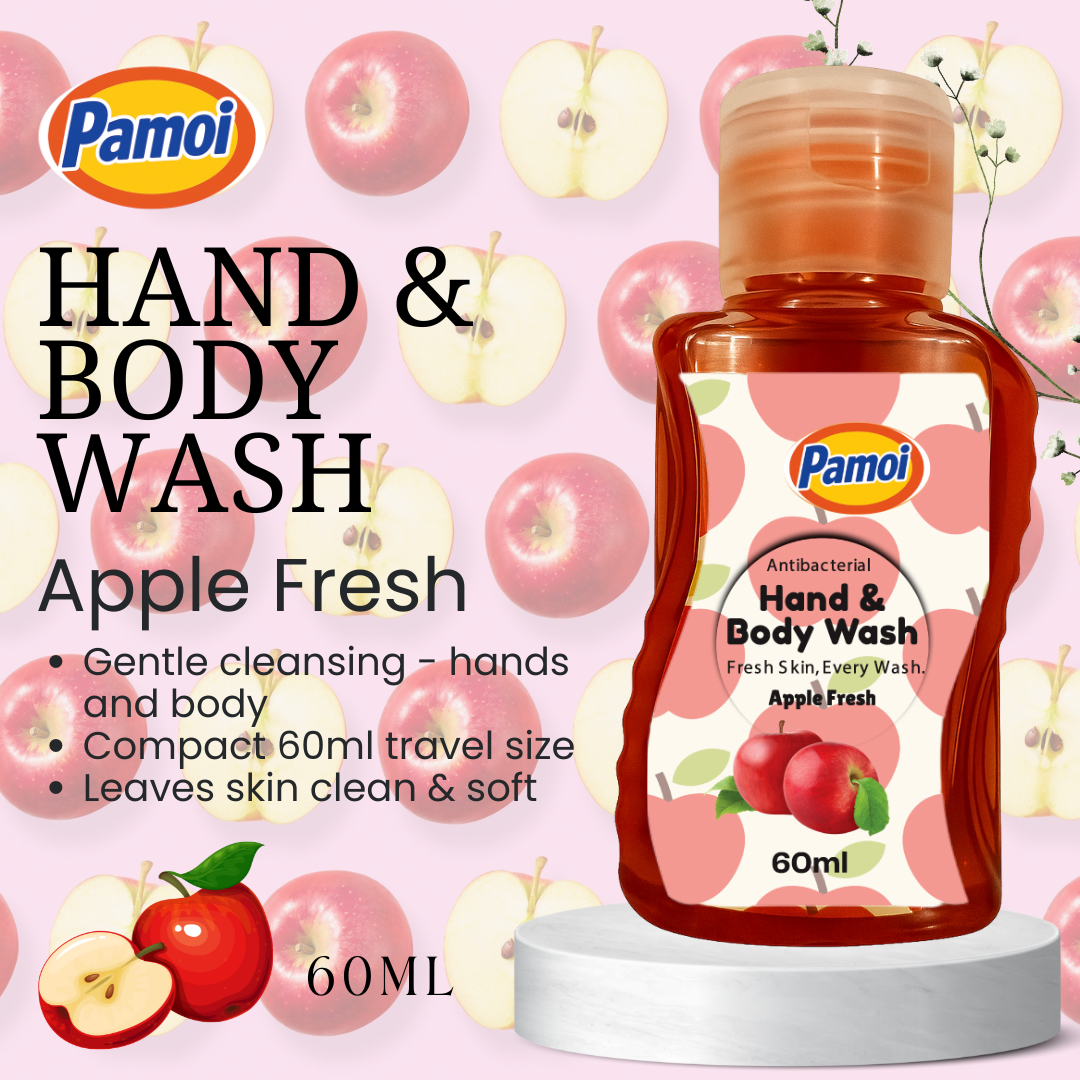 Pamoi Hand & Body Wash β Apple Fresh offers a crisp, clean cleansing experience in a convenient 60 ml travel-friendly size. Infused with the refreshing scent of green apples, this dual-purpose formula gently removes dirt and impurities while revitalizing your skin with a burst of fruity freshness. Its rich lather moisturizes as it cleanses, leaving your hands and body soft, smooth, and lightly scented. Perfect for daily use or quick clean-ups on the go, it fits easily into handbags, travel kits, or work desksβso freshness is always within reach.